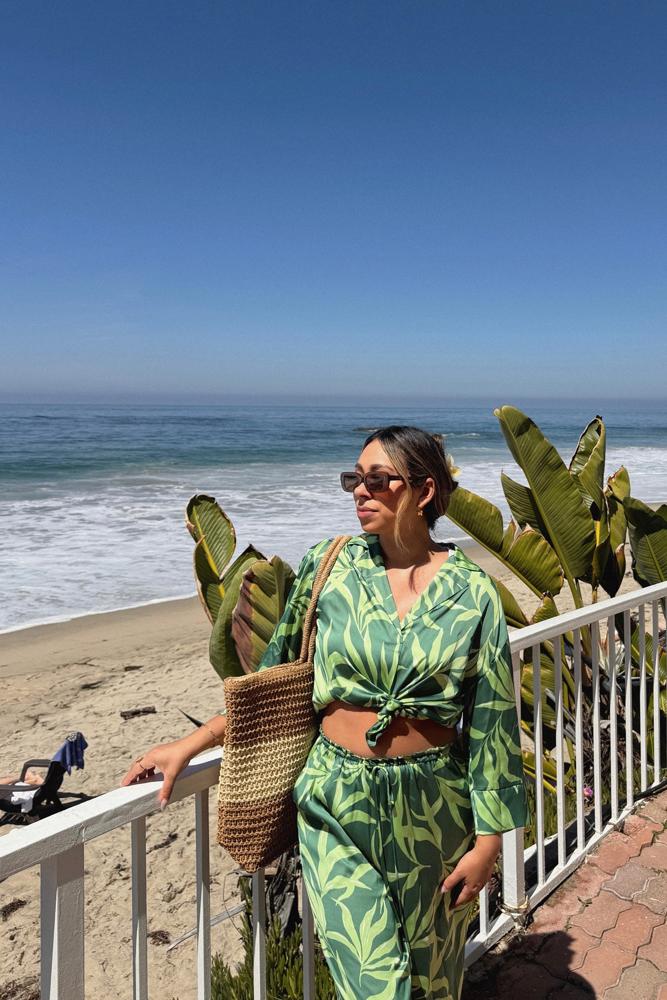 The Aurora 3/4 Sleeve Palm Print Collared Satin Button Up is a stunning addition to any wardrobe. Featuring a large floral print and luxurious satin fabric, this blouse combines elegance with comfort. The relaxed fit allows for easy movement while maintaining a sophisticated aesthetic. Perfect for both casual outings and dressed-up occasions, this versatile piece enhances any outfit. Pair it effortlessly with the matching satin pants for a complete look that radiates style and grace.