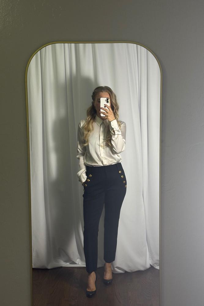 From the brand: Introducing the WHBM® Jolie Button Straight Luxe Stretch Pant. Super comfortable and soft, these pants have gold button embellishment on the pockets and belt loops, giving them a military flair. Pair with our matching WHBM® Stylist Jacket for a head-to-toe look. Your work to weekend wardrobe just got even more versatile.