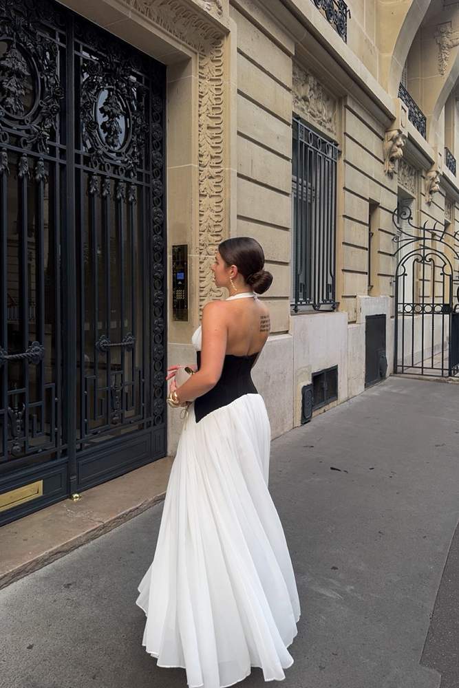 Introducing the Harlowe Contrast Corset Maxi Dress, where modern elegance meets timeless charm. Crafted from luxurious chiffon, this white maxi features a delicately gathered halter neckline, complemented by a structured black corset waist that accentuates the figure. Ideal for unforgettable occasions, this dress effortlessly exudes sophistication and style, making it the perfect choice for a standout statement piece in any wardrobe. From the brand: Dreamy and modern all at once; the Harlowe Contrast Corset Maxi Dress is a timeless standout. Crafted from luxurious premium chiffon fabric, this white maxi dress is delicately gathered across the halter neckline and below the corset for an effortless effect. The structured black corset waist creates a striking contrast while sculpting and emphasizing your figure. This dress is your go-to for making an unforgettable statement.
