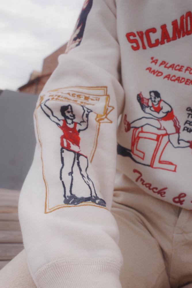 This heavyweight cotton French terry sweatshirt features a unique double V rib inset and flatlock seam construction, ensuring both comfort and style. Inspired by vintage yearbook doodles, it embodies a playful yet nostalgic vibe perfect for everyday wear. Designed in Los Angeles, this piece is machine washable for easy care, making it a versatile addition to any wardrobe. From the brand: Details 15 oz Heavyweight cotton French terry 1" neck rib with 3/16" coverstitch Classic double V rib inset at front and back neck Raglan sleeves Flatlock seam construction This garment has undergone a wash to remove all shrinkage French Terry Color: Natural Rib Color: Natural Embroidery color: Multi Size & Fit True to size Model is wearing a large Model measures: height 6'3" / 190cm XS S M L XL Chest 22" 23" 23.5" 24.75" 24.75" Length 26.75" 26.5" 27" 28" 28" Sleeve 33.25" 33.25" 33.5" 34.5" 34.5" Care & Origin 100% cotton Machine wash cold tumble dry low Designed in Los Angeles Imported Details This collection draws from the forgotten corners of old yearbooks — the margins, the doodles, and private jokes scrawled between classmates. We combed through school archives from the 1920s to the 1950s, inspired less by the posed portraits and more by what students left behind. From exaggerated mascots to cartoon-strip sketches about school sports, we were drawn to the personal expressions that turned ordinary pages into time capsules. Inspired by these artifacts of friendship and rivalry, we built our own cast of characters, invented crests, and created a fictional school spirit of our own. Each piece in the group carries the feeling of something lived-in and passed down—designed to feel like it once belonged to someone real.
