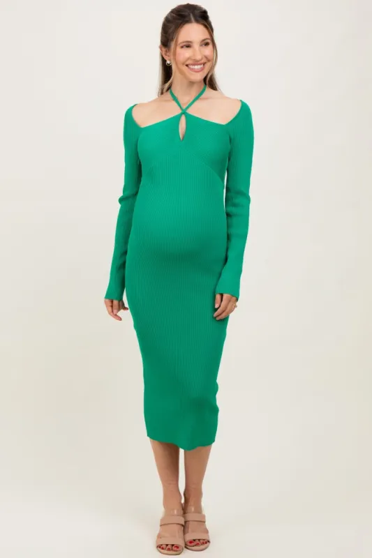 Ribbed Knit V Neck Midi Dress