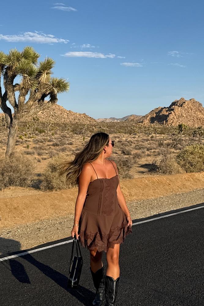 From the brand: Made for summer days spent losing track of time, this Boho-cute woven mini dress loves to show off at farmers markets and more. The A-line silhouette falls from adjustable straps into a ruffly, lace-trimmed straight neckline and a relaxed bodice with an intricate eyelash lace panel along the center. A trendy drop waist sits atop a tiered skirt with matching, scalloped eyelash lace trim. Hidden side zipper/clasp. Fit: This garment fits true to size. Length: Mid-thigh. Size medium measures 25.25" from top to bottom. Bust: Great for any cup size. Waist: Not Fitted - comfortable room throughout midsection. Hip: Not Fitted - room for hips. Undergarments: May be worn with a strapless bra, adhesive bra, petals, or no bra. Fabric: Fabric has no stretch. Lined. Shell: 100% Polyester. Lining: 97% Polyester, 3% Spandex. Hand Wash Cold. Do Not Bleach. Hang Or Line Dry. Low Iron If Needed. Imported. Lulus | Sahima Brown Lace Tiered Mini Dress | Size X-Small | 100% Polyester.