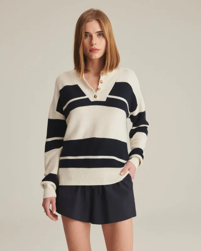 This elegant long-sleeve pullover henley sweater features a lightweight jersey stitch, perfect for layering or standalone wear. The slim fit and medium body length create a flattering silhouette, complemented by a 1x1 rib at the hem and cuffs. The stylish horn button closure adds a unique touch, while fashioning at the shoulder and armhole enhances its design. With signature cable knit detailing at the center back, this piece combines sophistication with casual comfort. From the brand: Long sleeve pullover henley sweater. Lightweight, jersey stitch. Slim fit, medium body length, regular sleeve length. 1x1 rib at hem and cuff. Neck trim in 1x1 rib. Horn button closure. Fashioning at shoulder and armhole. Signature center back cable knit detail.