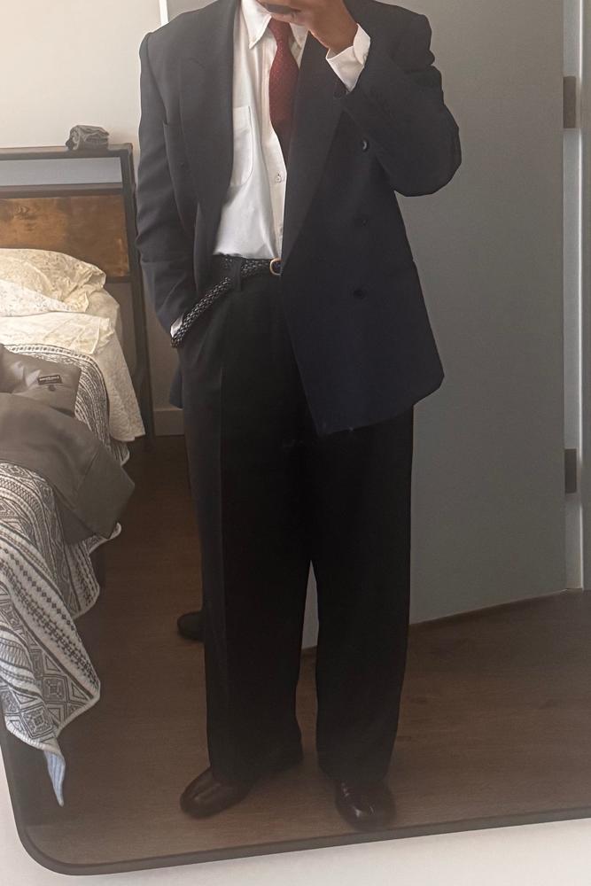 From the brand: The Classic Trousers have a wide straight fit with double pleats and a mid-rise. Featuring side pockets, rear welt pockets, button fastening, hook-and-eye closure and YKK zip fly. Cut from a fine, smooth deadstock wool twill in dark brown.