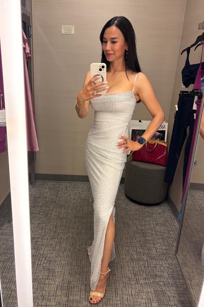 HOUSE OF CB Calla Beaded Mesh Overlay Gown in Nimbus Cloud at Nordstrom, Size Medium