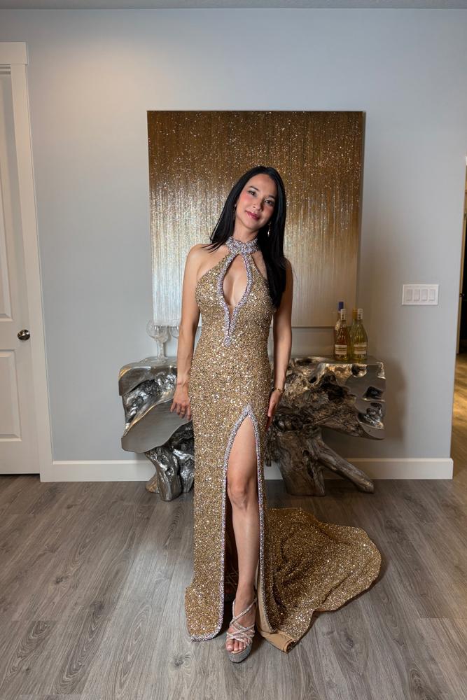 Make a dazzling entrance in this stunning beaded halter neck gown, featuring a dramatic keyhole cut-out and a chic left-leg slit. With crystal-trimmed detailing, this fully beaded dress is perfect for formal events. Available in gold, emerald, fuchsia, and nude, it comes in a range of sizes to fit various body types. Experience elegance and glamour that make this gown a standout choice for any special occasion. From the brand: Be the star of the show in this fully beaded halter neck gown. This dress features a keyhole cut-out and a left-leg slit. Details: Halter Neckline Cut Outs Crystal Trimmed Neckline & Slit Fully Beaded Length: High Point shoulder to floor 64" or 162 cm Style 11634 Color: Gold, Emerald (Green), Fuchsia, Nude (Wheat) Sizes: 0,2,4,6,8,10,12,14,16 The model is 5.8"/size 2 and wearing size 4 or XS in the picture Please contact us to check the availability of this product If it is in stock, this item will be shipped in 2 Business days Due to the nature of the garments, we only accept returns, refunds, cancellations, or exchanges if the item was damaged upon receipt. Unless dresses are damaged, defective, or incorrectly delivered (i.e. incorrect item is delivered, item delivered to address other than provided at the time of order, etc.), they CANNOT be returned or exchanged.