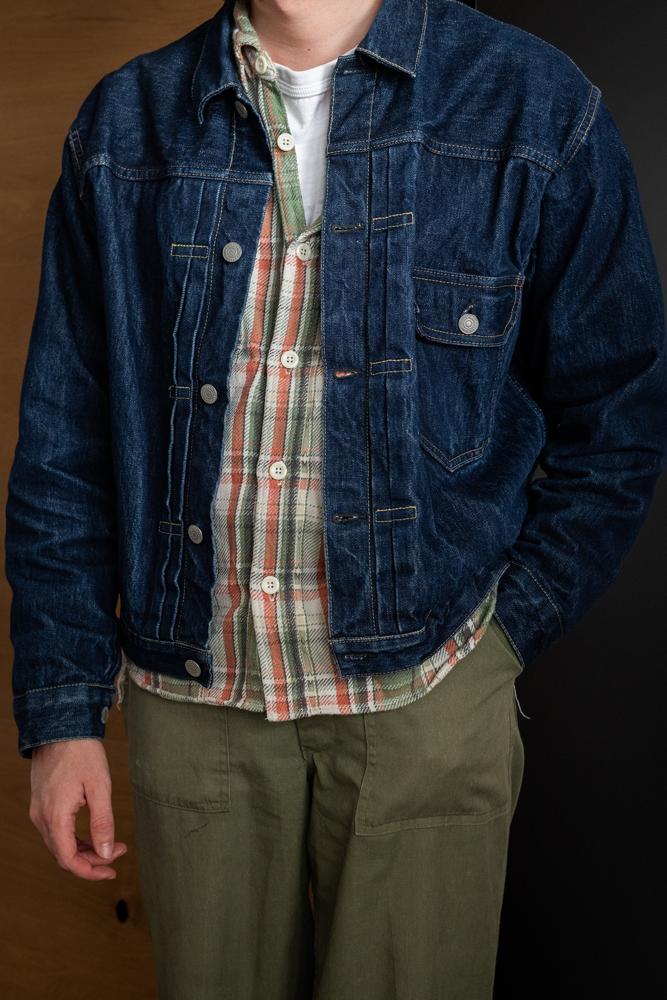 This 40s Type 1 Pleated Front Blouse Jacket in indigo is crafted from premium Japanese denim, offering a timeless style with a regular fit. The washed finish and metal buttons accentuate its casual elegance. Featuring a single chest pocket and a cinch back on the bottom hem, this jacket is perfect for layering or standalone wear. Its versatile design makes it an ideal addition to any wardrobe, seamlessly blending retro charm with modern practicality.