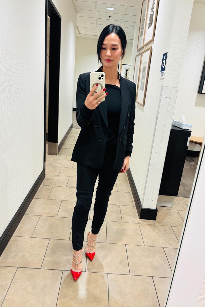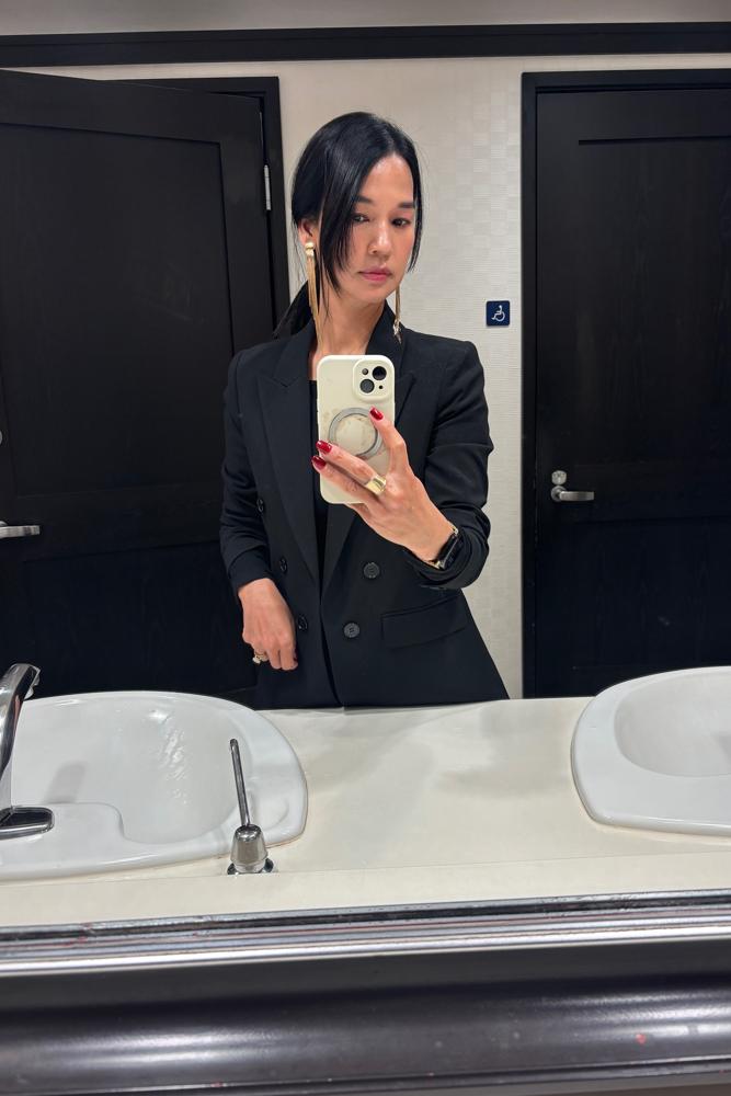 From the brand: This polished blazer is designed in a double-breasted silhouette with peaked lapels and five-button cuffs. 27" length (size Medium) Peaked lapels Five-button cuffs Lined 63% polyester, 33% rayon, 4% spandex Dry clean Imported