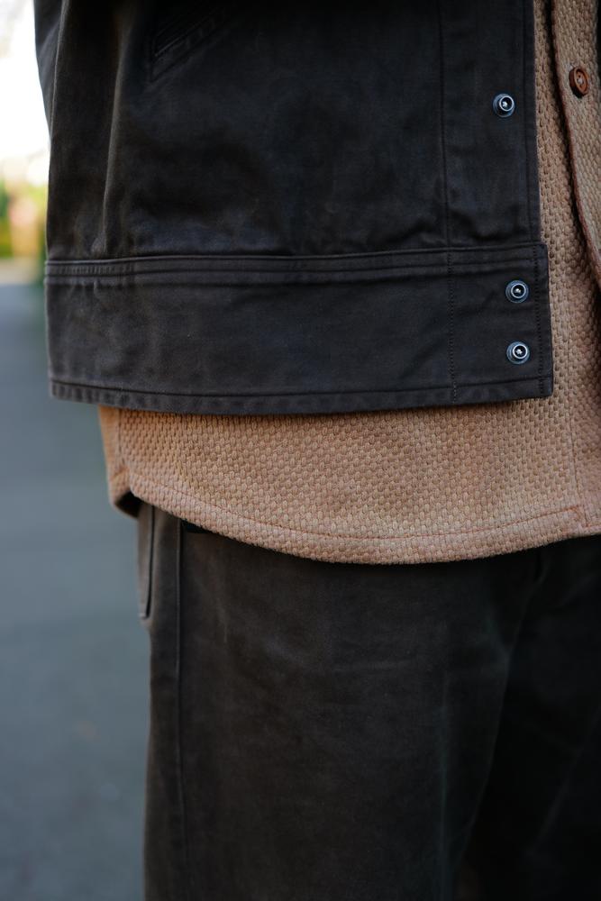 This relaxed fitting snap front jacket combines functional elegance with a rich, hand-dyed brown hue reminiscent of military garments. Crafted from high density cotton sateen, it features minimal detailing, a sharp collar, and inseam pockets for daily essentials. The design's subtly dropped shoulders enhance comfort, while the banded waist creates a flattering silhouette. Ideal for transitional weather, this jacket offers durability with its chain-stitched seams and gunmetal hardware, promising to soften beautifully with age. From the brand: A relaxed fitting, snap front jacket cut from a sturdy, high density cotton sateen in a rich mud-dyed brown. Based on standard issue jackets provided to recovering US soldiers in hospitals, the minimal detailing with a sharp collar and welted hand pockets is emblematic of the functional elegance often seen in military garments. Subtly dropped shoulders shift volume to the sides while the banded waist anchors the silhouette, allowing it to sit slightly away from the body at the hem. Constructed using chain stitched, flat felled seams throughout for a long lasting finish that leaves an encased interior; gunmetal tone hardware throughout. Each garment is dyed one by one, by hand, in the iron rich muds of Amami Oshima Island, producing a rich deep brown. The fabric surface is initially quite stiff and crisp, but softens with age as the colour begins to fade. Use caution when wearing with lighter coloured fabrics, some colour transfer may occur.
