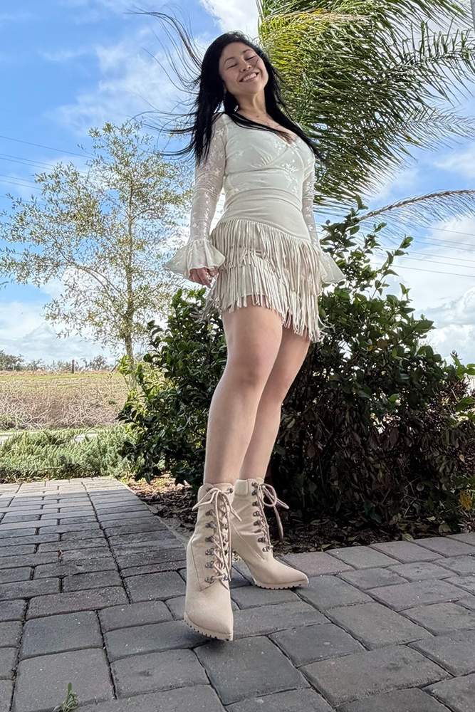 The Fringe Mini Skirt is playful and flirty, with fringe detailing and a mini length, made from lightweight faux suede with a fitted waist; best for parties or nights out.