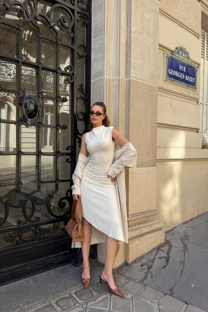 The MILASANDRA Pleated Knit Dress features sculptural texture and a sleek silhouette, showcasing an asymmetrical neckline and cap sleeve that elegantly frame the upper body. Its pleated knit fabrication adds depth and movement, cascading into a refined midi length for effortless sophistication. Designed without lining for a lightweight feel, this dress perfectly balances contemporary aesthetics with wearability, making it ideal for both casual outings and special occasions. From the brand: Soft folds, strong form. The MILASANDRA Pleated Knit Dress brings sculptural texture to a sleek silhouette. Designed with an asymmetrical neckline and cap sleeve, it frames the upper body with clean, directional lines. The pleated knit fabrication introduces depth and movement, enhancing the form as it falls into a refined midi length. Unlined for a lightweight feel, this piece balances contemporary shape with effortless wearability.