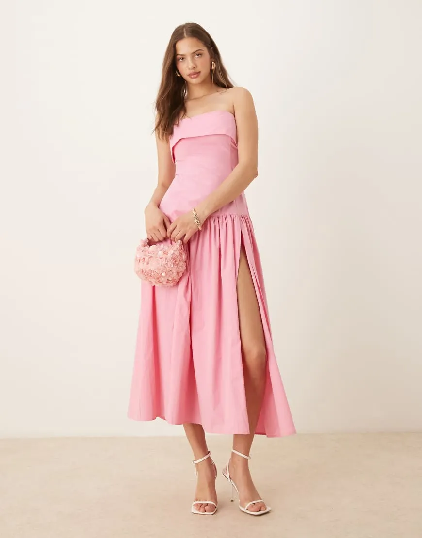 ASOS DESIGN fold over bandeau midi dress with asymmetric detailing in pink